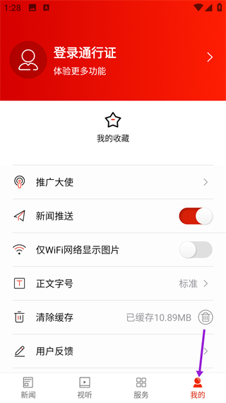 4、切換到我的界面,可進行登錄操作,還有我的收藏、設置等功能,管理個人相關的收藏與使用設置,調整使用體驗。
