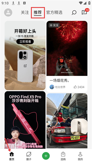 1、首頁推薦板塊,展示一加15開箱、OPPO煙花拍攝等內容,是產品資訊和用戶分享平臺,底部有首頁、圈子等導航。