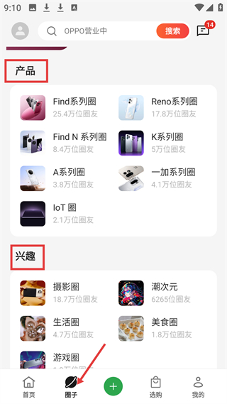 2、圈子板塊分產品和興趣類圈子,產品圈有Find、Reno等系列,興趣圈含攝影、生活等,供用戶交流。
