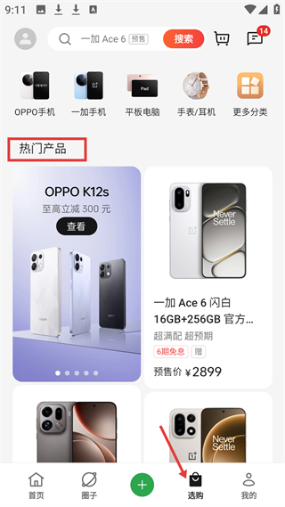3、選購板塊展示OPPO、一加熱門產品,如OPPO K12s、一加Ace 6等,提供多品類選購,助力用戶購買產品。