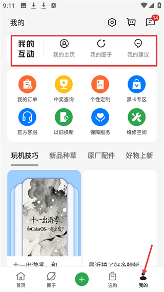 4、我的板塊有我的互動主頁、圈子、建議和實用功能訂單、客服等,還有玩機技巧資訊,是用戶管理和獲取服務的入口。