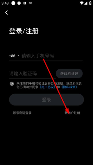 3、登錄、注冊界面可選擇驗證碼登錄,輸入手機號碼后獲取驗證碼,未注冊用戶驗證后自動注冊,也可選擇賬號密碼登錄或新用戶注冊。