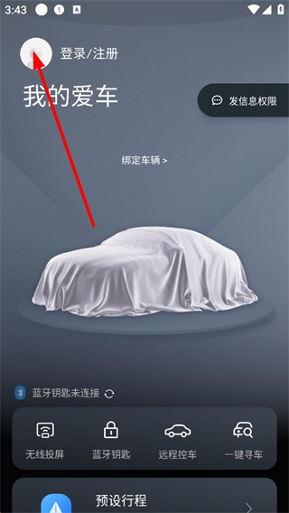 1、進入應用后可看到我的愛車界面,這里有綁定車輛入口,還展示藍牙鑰匙未連接狀態,底部有無線投屏藍牙鑰匙等車輛控制功能,可進行車輛相關操作。