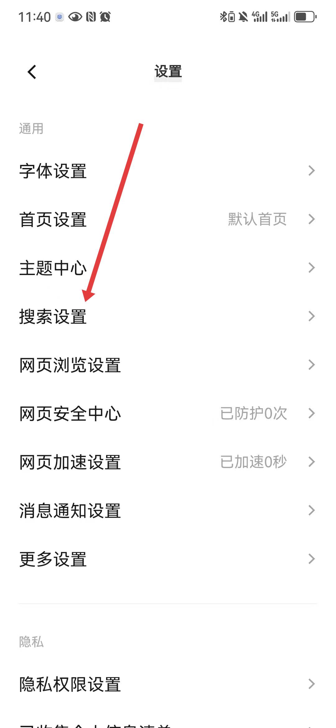 1、打開vivo瀏覽器進入設置界面,在設置列表里找到搜索設置選項點擊進入,這里可對瀏覽器搜索相關功能進行配置,是更改搜索引擎的前置步驟。