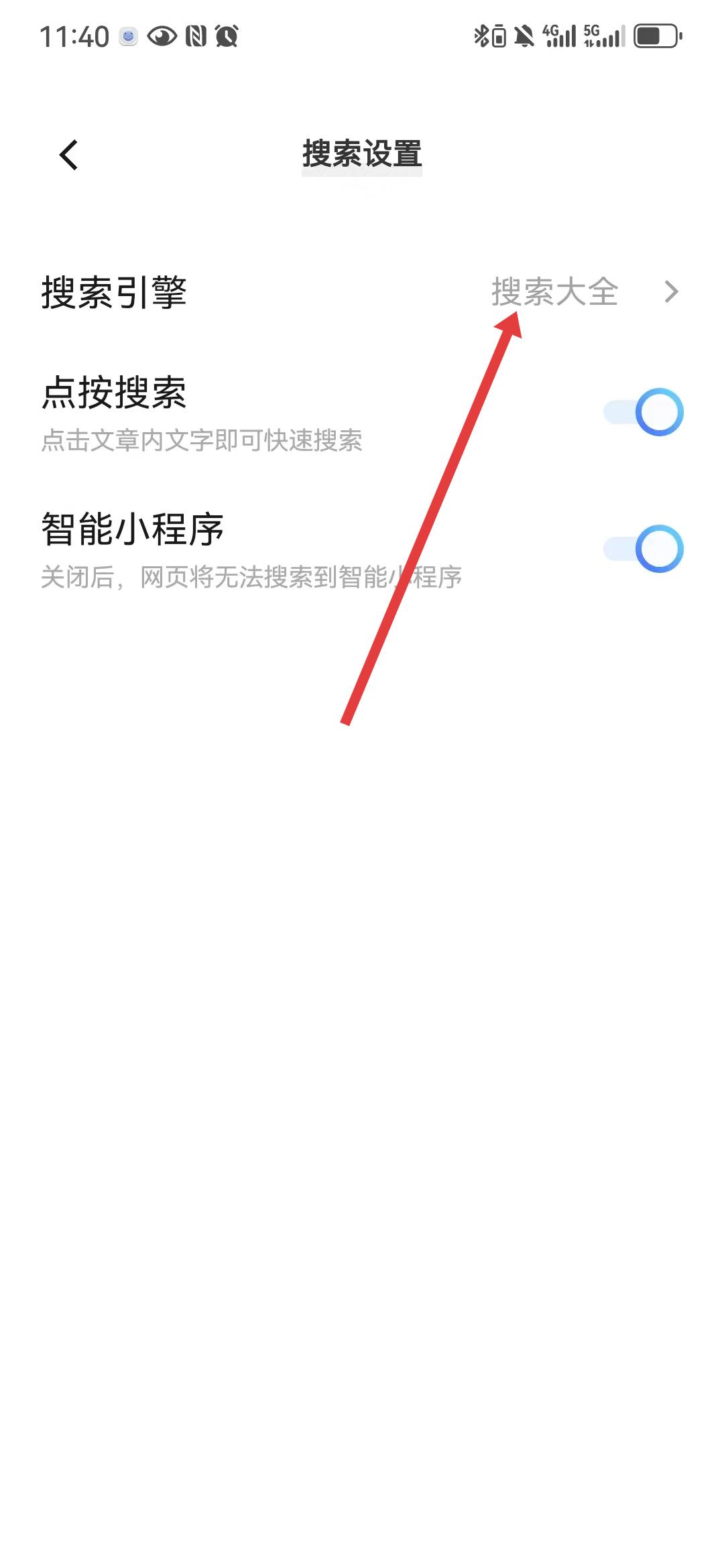 2、進入搜索設置頁面后找到搜索引擎選項,其右側顯示當前默認搜索引擎,點擊該選項就能進入搜索引擎選擇界面,為更換成谷歌搜索引擎做準備。