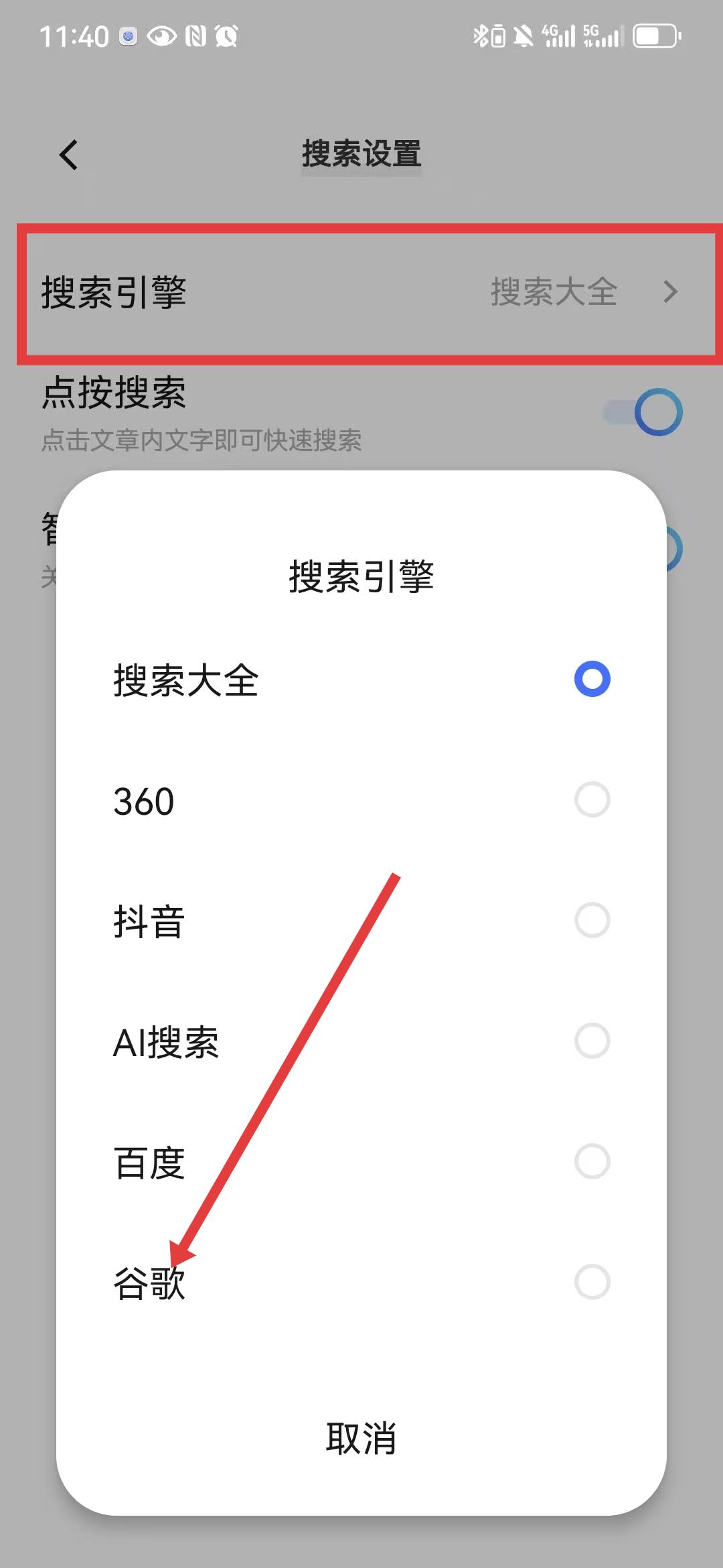 3、在彈出的搜索引擎選擇列表瀏覽可選的搜索引擎,找到谷歌并點擊,這樣vivo瀏覽器就會將谷歌設置為默認搜索引擎,會通過谷歌搜索引擎獲取結果。