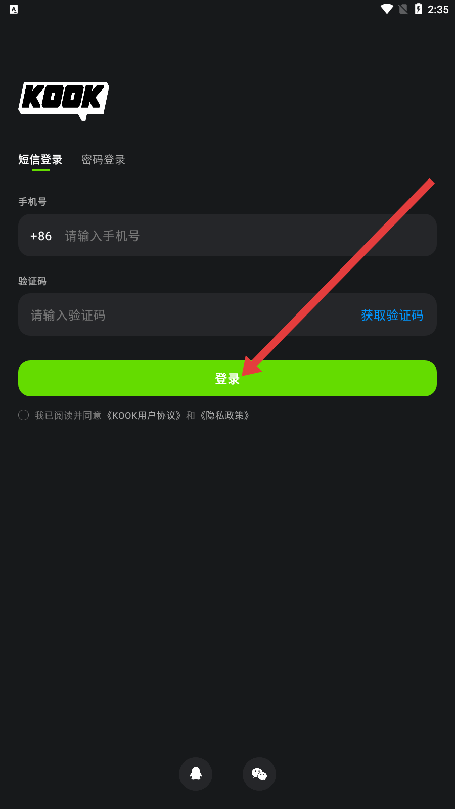 1、進入KOOK登錄界面,可選擇短信登錄,輸入手機號和驗證碼,勾選同意用戶協議和隱私政策后,點擊登錄按鈕,完成賬號登錄。