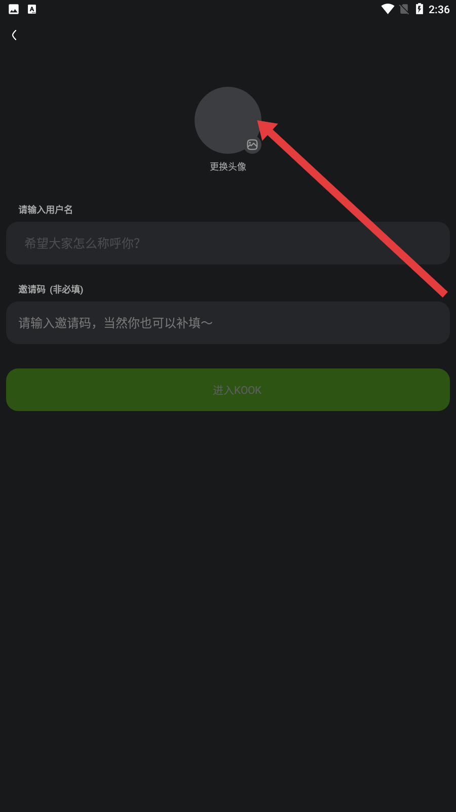 2、登錄后進入個人信息設置頁面,可更換頭像,輸入用戶名,填寫邀請碼非必填,完成后點擊進入KOOK,進入下一步操作。