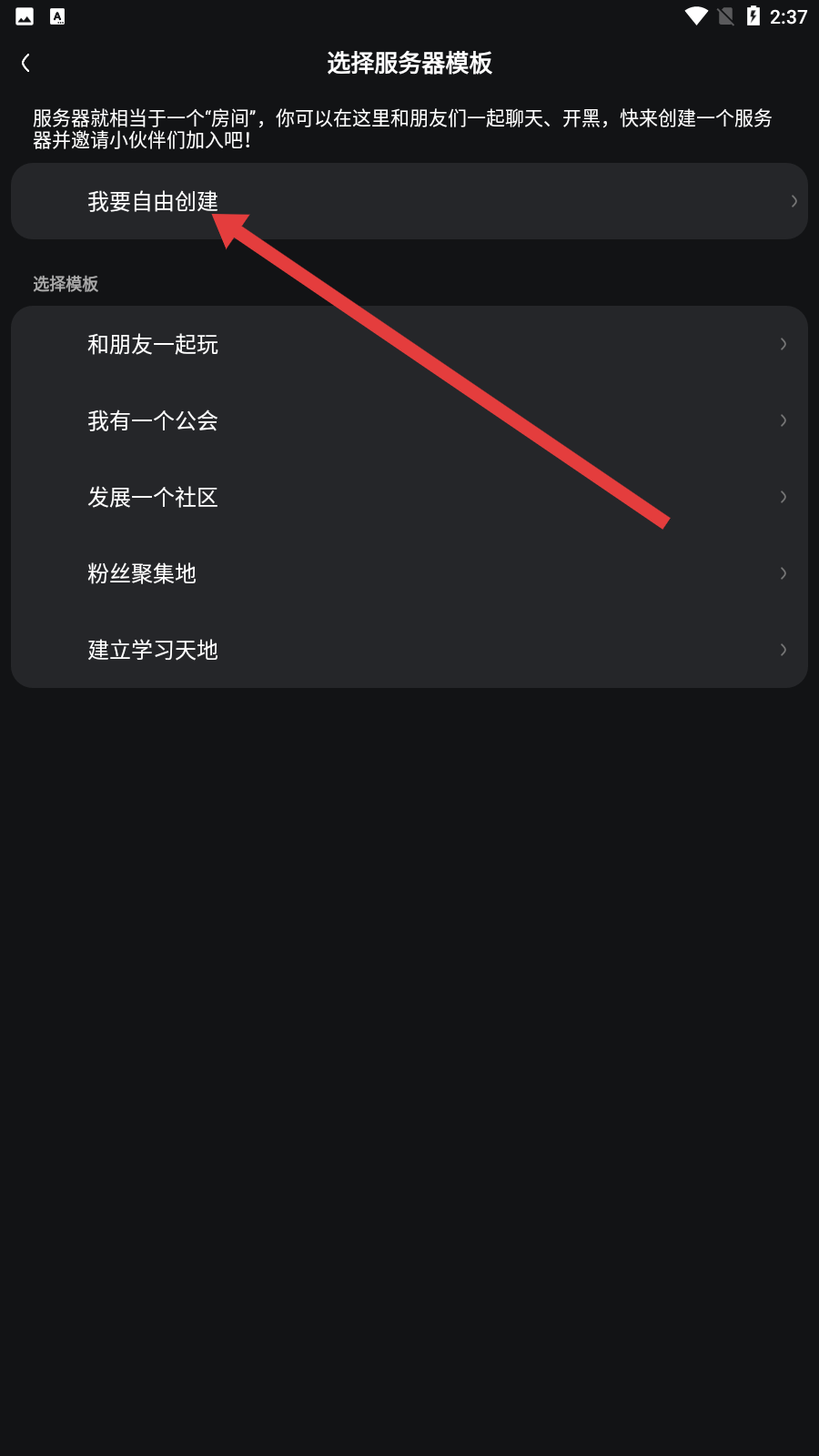 4、選擇服務器模板頁面,可選擇我要自由創建,也可選擇和朋友一起玩、我有一個公會等模板,選擇后即可創建屬于自己的服務器。