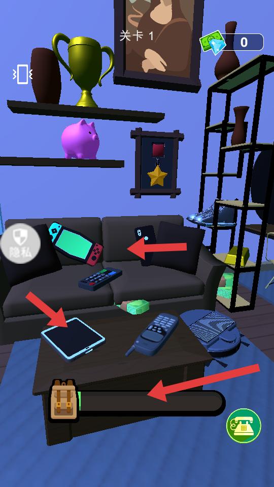 1、在房間里收集平板電腦,游戲機等物品,放入背包,積累資源,為后續關卡挑戰做準備。