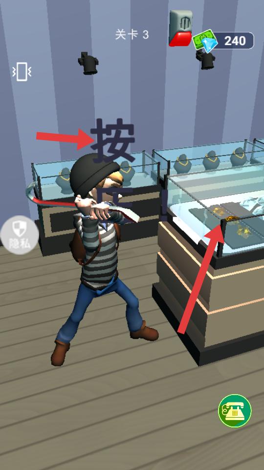 3、按照按壓的提示操作,對珠寶展示柜等進行互動,嘗試獲取里面的珠寶,完成關卡目標。