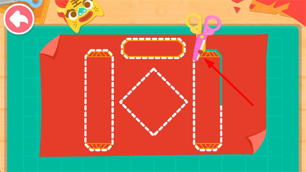 2、切換到手工界面,按照虛線指引用剪刀裁剪紅色紙張,裁剪出福字相關的形狀部件,完成基礎材料的準備步驟。