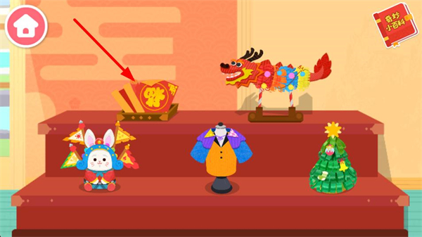 1、先看到擺放著春聯舞龍等新春裝飾的場景,選擇對應的春聯道具,開啟新春主題的手工制作流程,準備進行后續操作。