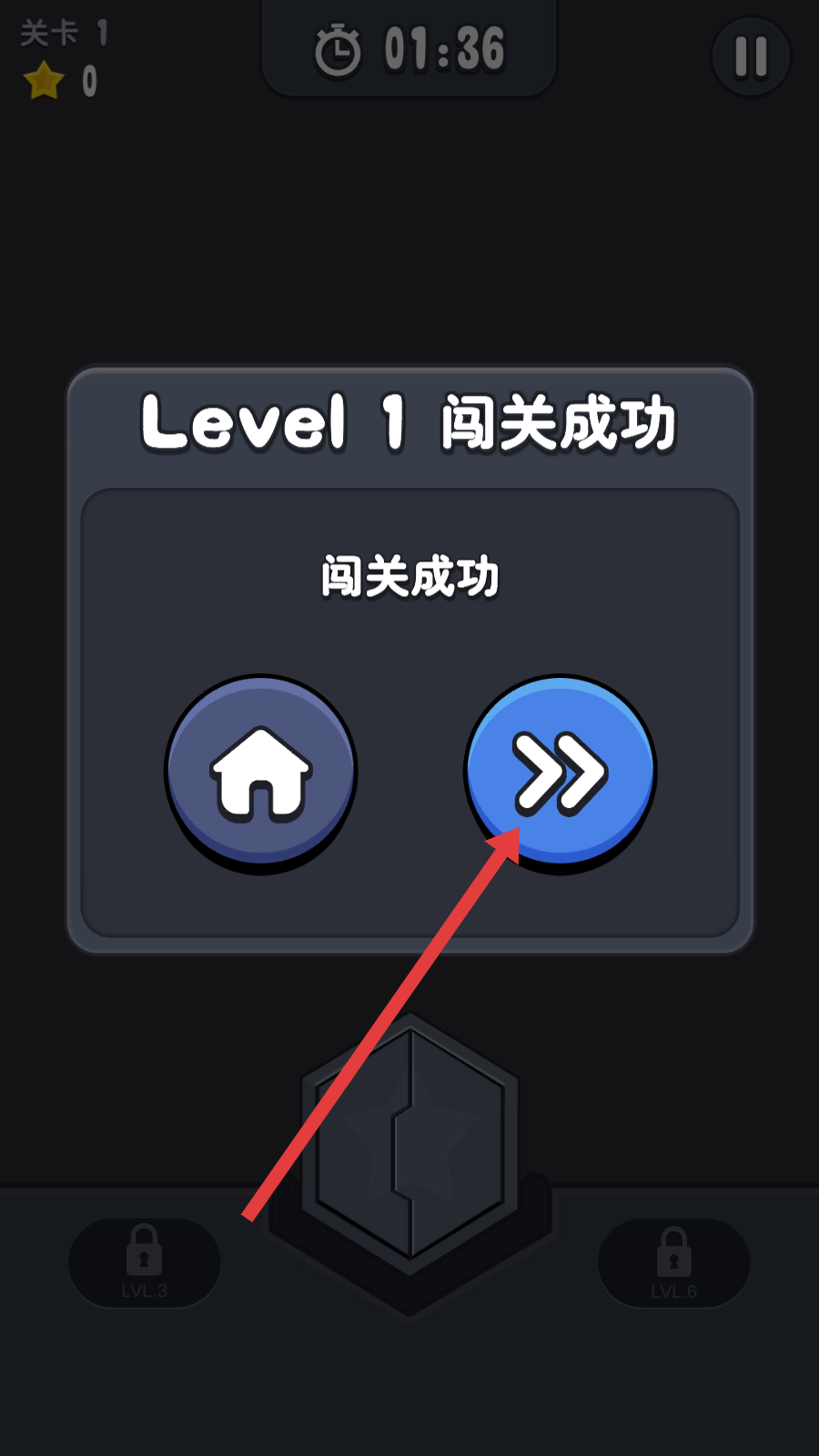 4、當所有物品都成功配對歸位后,界面會顯示關卡1闖關成功,此時可選擇進入下一關,繼續新的物品歸位挑戰。