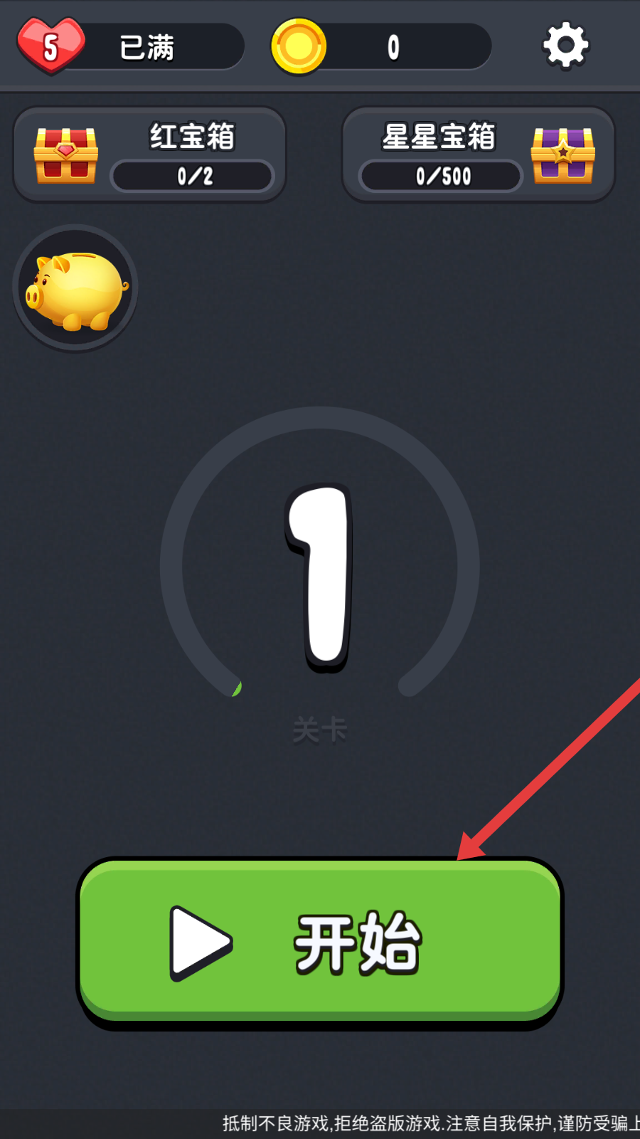 1、游戲開始,界面顯示關卡1,有紅寶箱、星星寶箱等元素,點擊綠色開始按鈕,即可進入關卡開始游戲。