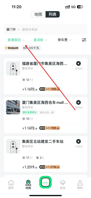 4、在列表頁面可選擇距離較近、直流樁等篩選條件,查看福建省廈門市集美區的多個充電站,了解充電價格和停車情況,選擇合適的充電站。