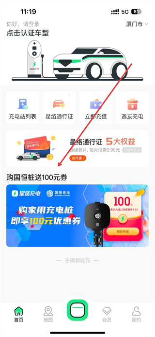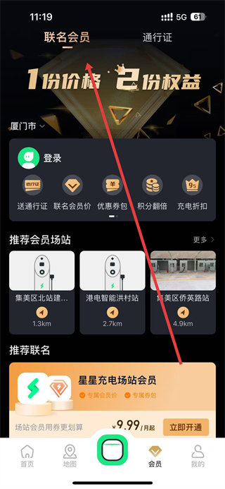 1、進入星絡充電app,可查看充電站列表、星絡通行證等功能,點擊會員可進入聯名會員頁面。
