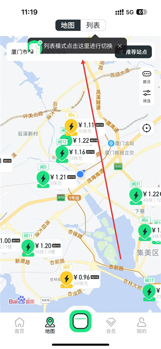 3、在地圖頁面可查看廈門市的充電站分布,點擊列表模式可切換為列表查看,選擇推薦站點可查看優質充電站。