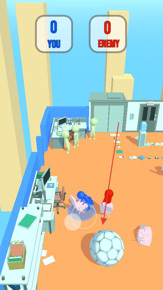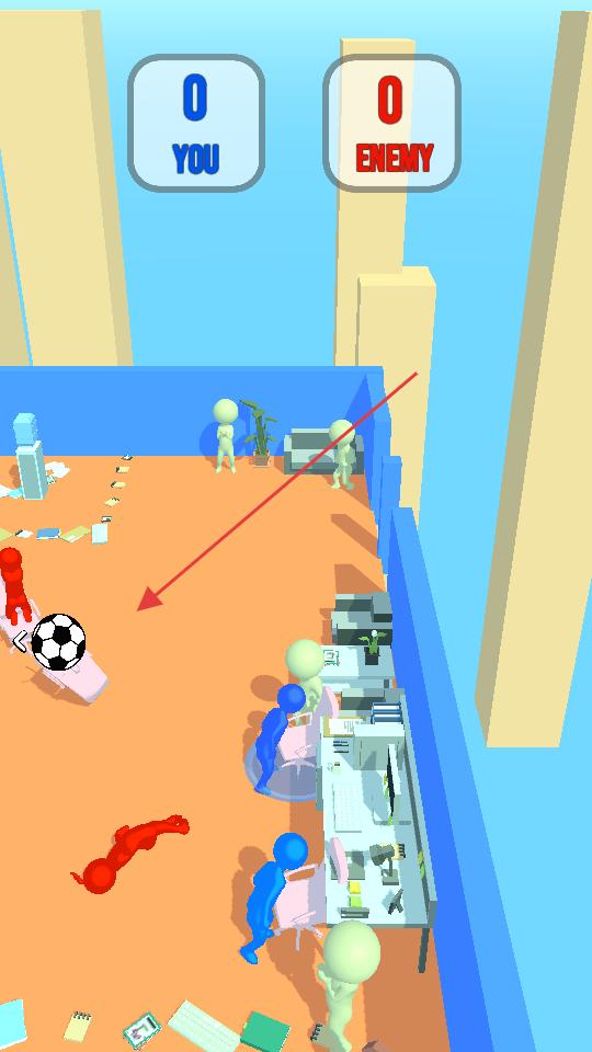 3、尋找合適的射門機會,同時防范紅色敵人前來爭搶,此時留意辦公室內的障礙物和可利用的空間,規劃射門路線。