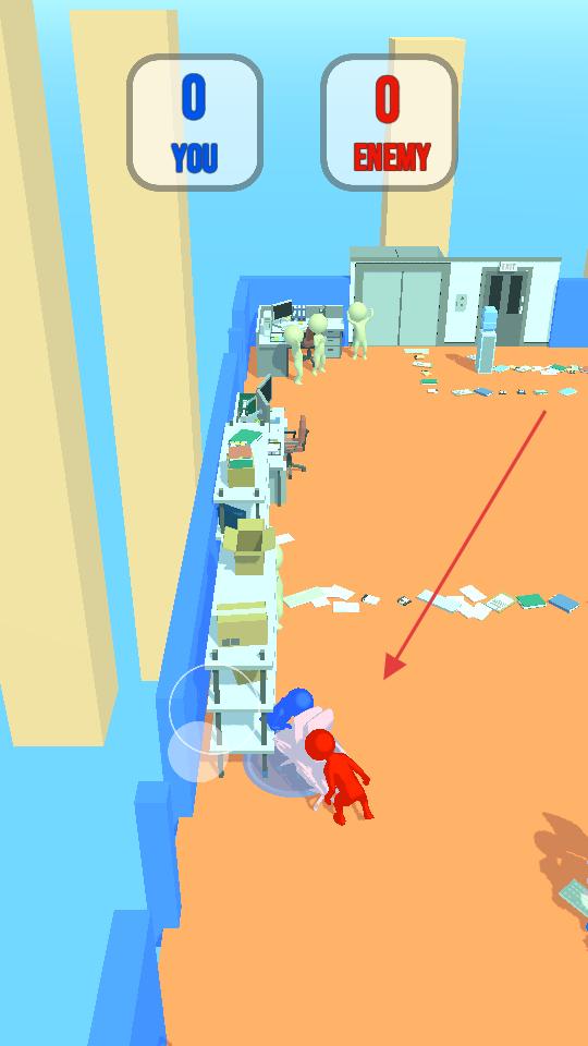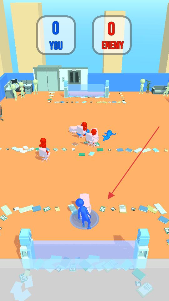 1、進入辦公室聯盟游戲,操控藍色小人在辦公室場景中移動,留意周圍的紅色敵人和散落的物品,為搶奪足球做準備。