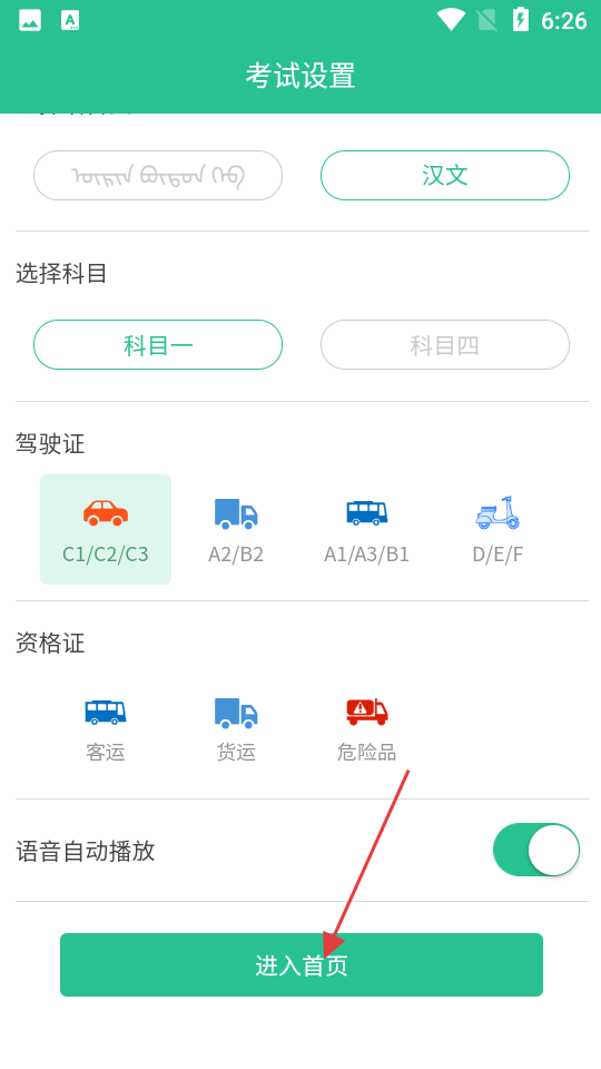 1、首先進入考試設置頁面,在這個頁面你可以選擇考試語言、考試科目、駕駛證類型等,點擊進入首頁按鈕,即可進入蒙文駕考app的首頁。