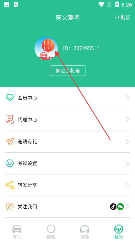 2、進入個人中心頁面,頁面下方有會員中心、代理中心、邀請有禮、考試設置、轉發分享、關注我們等多個功能選項,點擊綁定手機號按鈕,進入綁定手機頁面。