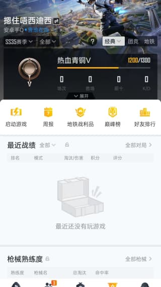 4、進入個人戰績頁面,可查看熱血青銅V等級信息、最近戰績和槍械熟練度,了解個人游戲表現。