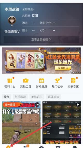 1、和平營地首頁,可查看本周戰績、游戲資訊,使用福利中心、營地工具等功能,獲取游戲動態和輔助工具。