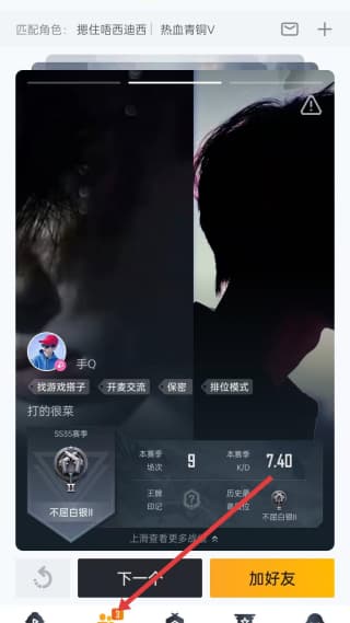 3、匹配角色頁面,可查看玩家的游戲信息,如段位、KD等,點擊加好友可添加游戲好友,進行游戲社交。