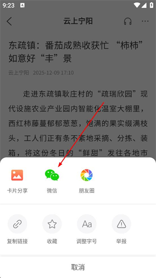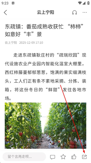 3、在新聞詳情頁閱讀產業園內番茄種植及收獲的內容,了解當地農業產業的豐收情況,點擊分享按鈕。