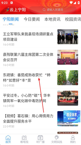 2、登錄后進入首頁瀏覽寧陽新聞板塊內容,找到東疏鎮番茄成熟收獲相關資訊,點擊該資訊,進入對應的新聞詳情頁面。