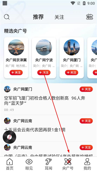 4、進入央廣號板塊瀏覽精選的地方賬號,查看賬號簡介及發布內容,點擊賬號旁的關注按鈕,關注感興趣的賬號,以便后續查看其更新。