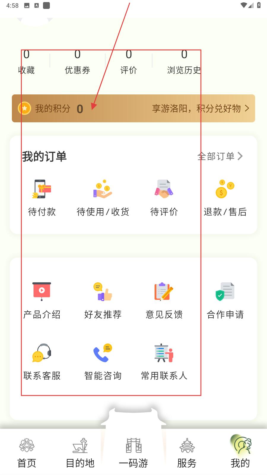 1、進入我的界面,可管理收藏、優惠券等,查看積分并兌換好物,還能處理訂單、參與好友推薦等,方便一站式管理旅游相關信息與服務。