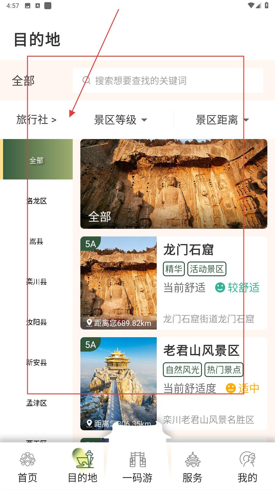 3、還可目的地界面可搜索關鍵詞,按旅行社、景區等級、距離篩選,涵蓋龍門石窟、老君山等5A景區,方便游客精準找到洛陽心儀景點。