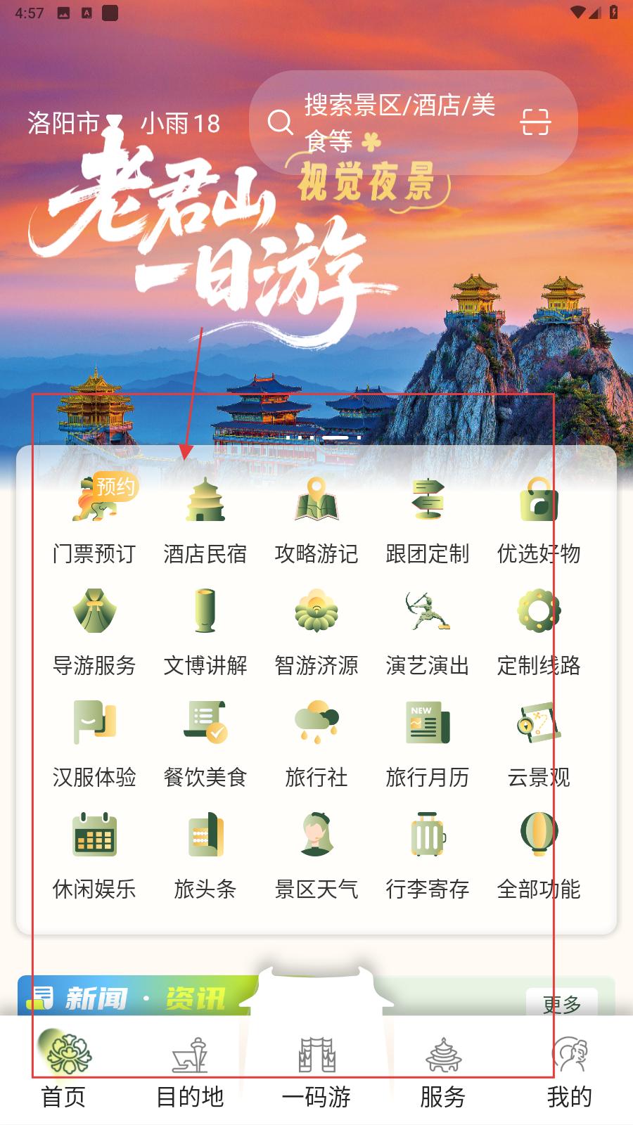 4、在首頁有門票預訂、酒店民宿等功能入口,還有導游服務、漢服體驗等特色服務,助力游客在洛陽老君山等景點便捷規劃行程,享受豐富旅游體驗。