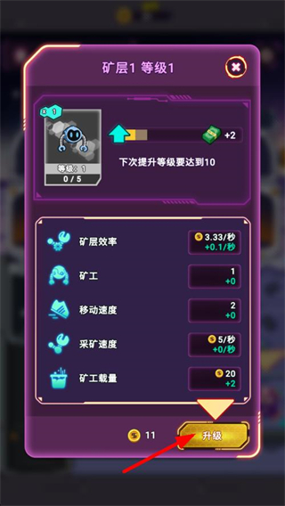 1、查看礦工等級及礦層效率采礦速度等屬性,消耗11金幣點擊升級按鈕,提升礦層等級,解鎖更多屬性加成。