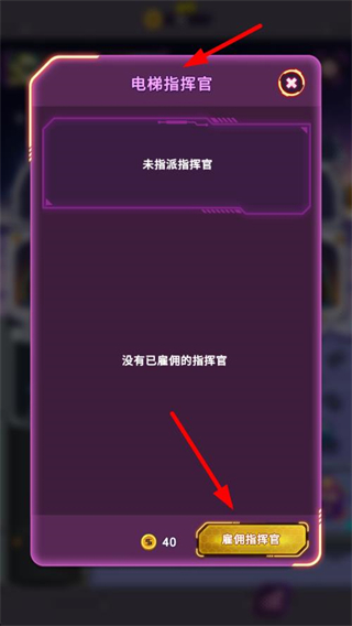 4、進入電梯指揮官界面,同樣可消耗40金幣雇傭對應的指揮官,雇傭后未指派的指揮官可進行分配,提升電梯相關的采礦輔助效率。