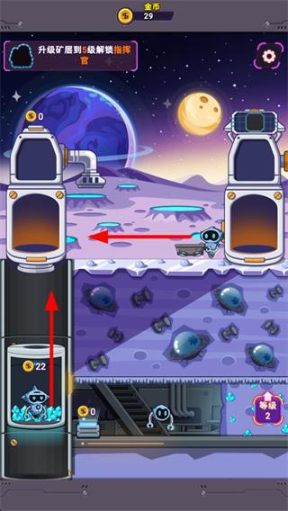 2、在星際場景控制礦工移動至礦石區域采集資源,采集的資源會通過電梯運送至上方,積累金幣,同時可查看當前金幣數量及礦層等級。