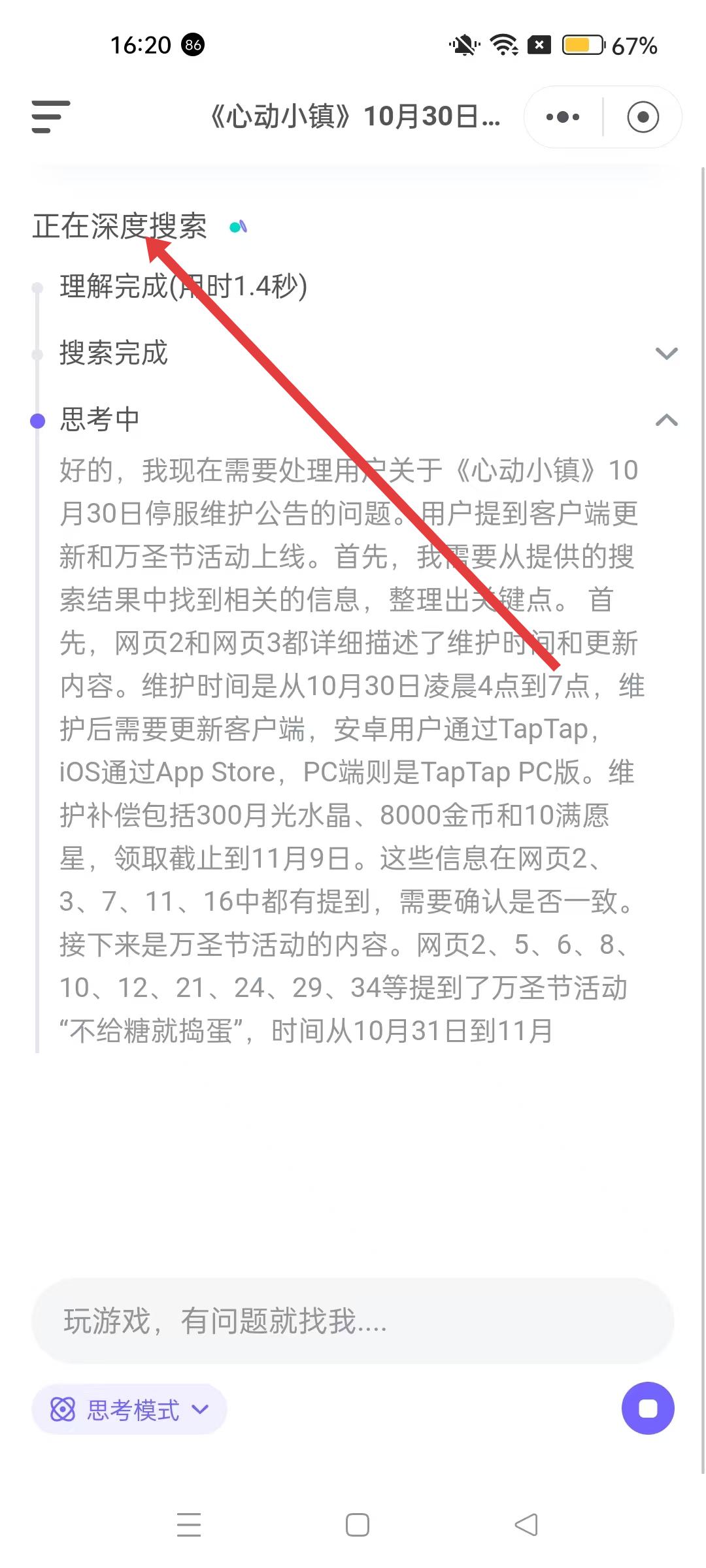 3、AI搜索中選擇心動小鎮停服維護公告,可查看深度搜索結果,了解維護時間、客戶端更新及萬圣節活動等詳細內容。