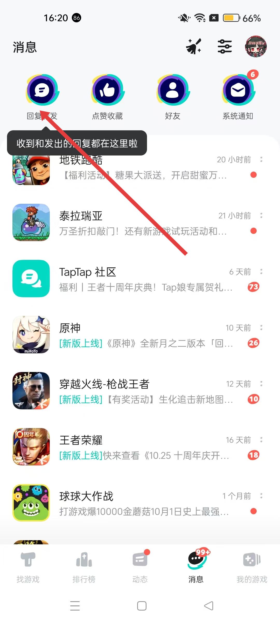 4、進入消息界面,可查看回復、點贊收藏、好友、系統通知等板塊,及時獲取跑酷、泰拉瑞亞等游戲的最新動態。