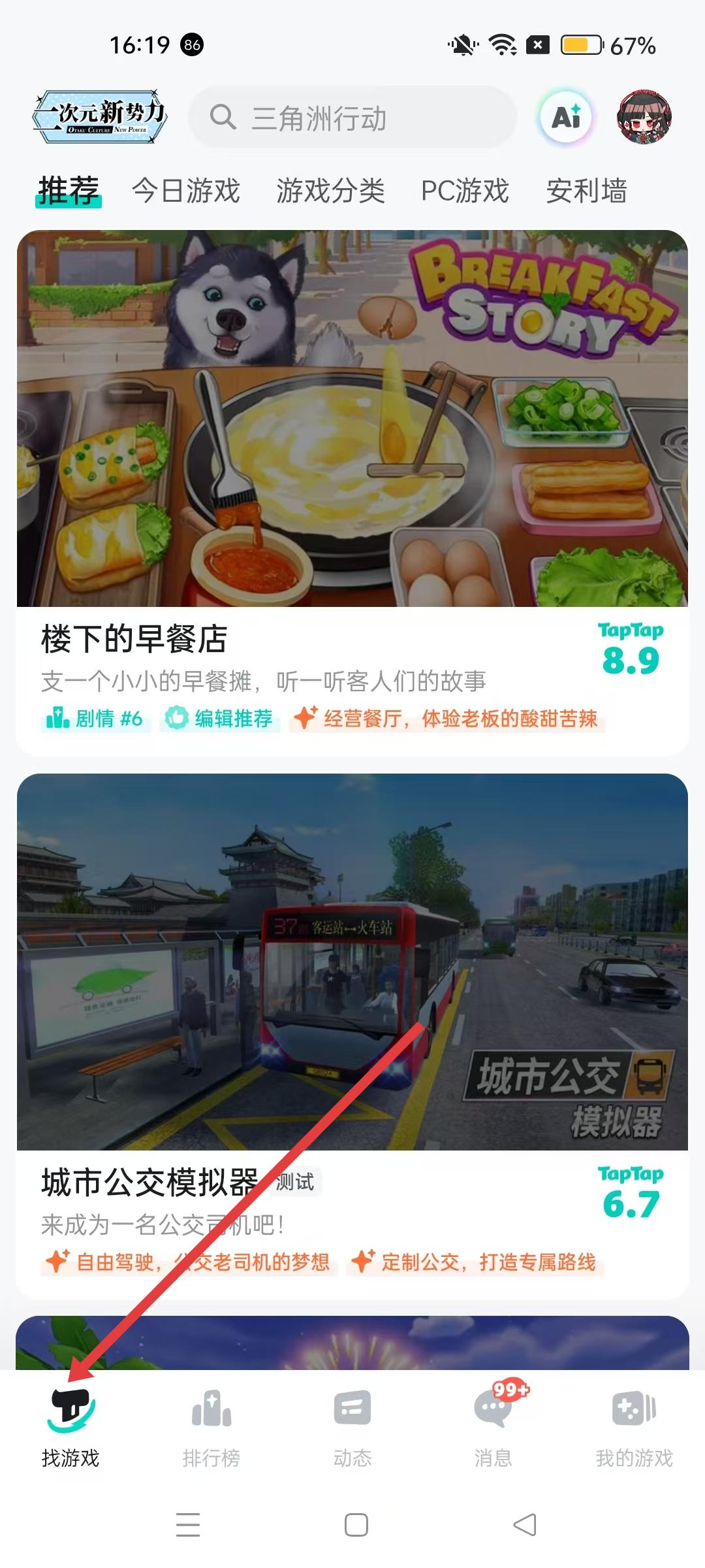 1、打開TapTap應用,進入找游戲界面,可瀏覽樓下的早餐店、城市公交模擬器等推薦游戲,開啟游戲探索。