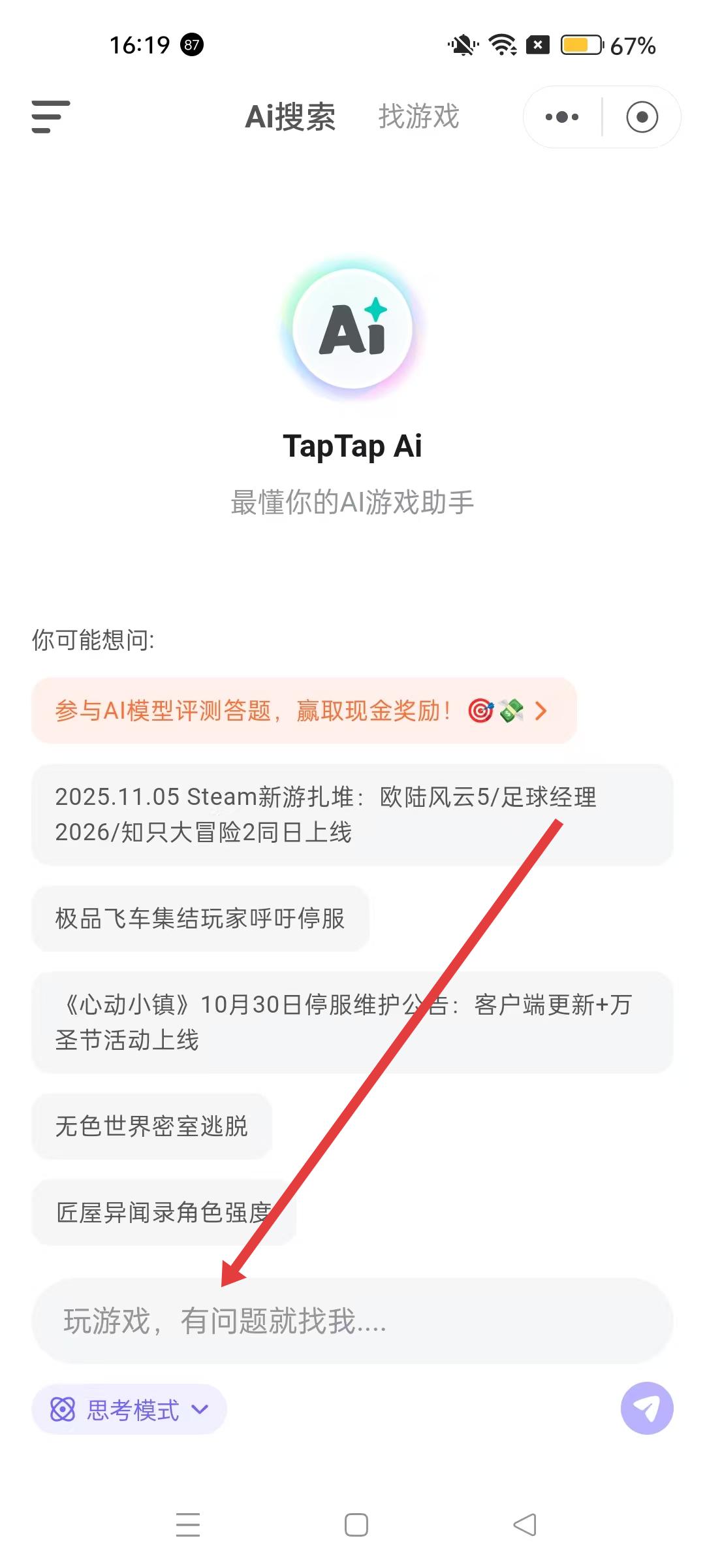 2、點擊AI搜索,進入TapTap AI界面,可查看游戲相關資訊,如Steam新游上線、游戲停服維護公告等,獲取游戲信息。