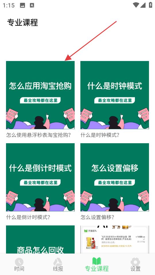 2、專業課程界面,展示了多個與購物和時間相關的課程,包括怎么應用淘寶搶購,方便用戶學習相關的知識和技能。