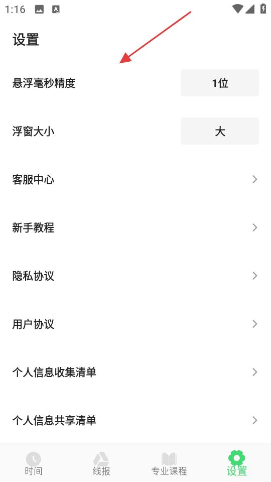 3、設置界面,用戶可設置懸浮毫秒精度、浮窗大小等選項,也可查看客服中心、新手教程等內容,方便用戶根據自己的需求進行相關設置。