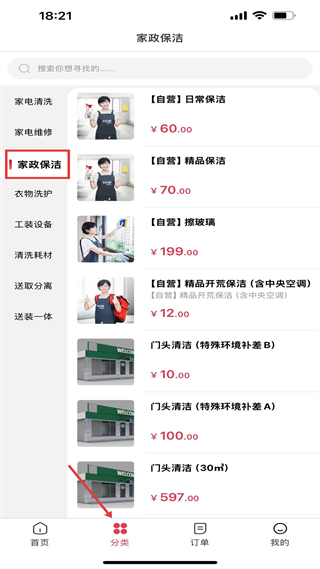 1、分類頁的家政保潔板塊,展示日常保潔、擦玻璃等自營服務,清晰標注對應服務價格,是選擇家政保潔服務的核心入口。