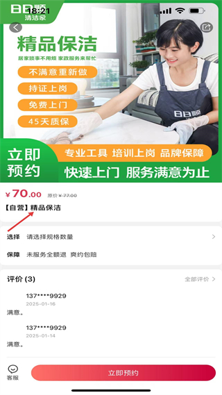2、精品保潔服務頁呈現持證上崗、45天質保等服務保障,顯示明確價格及用戶評價,提供規格選擇與立即預約功能方便下單。