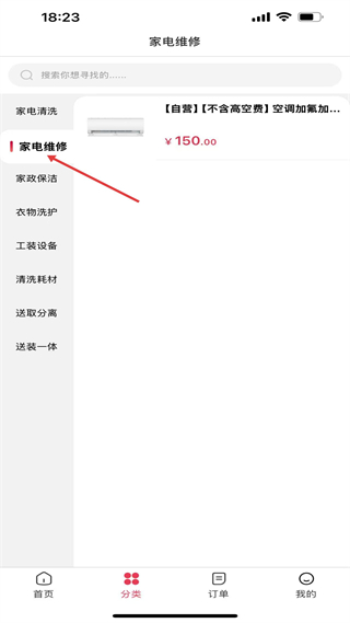 3、家電維修板塊聚焦空調加氟等自營服務,逐一標注每項服務價格,是精準選擇家電維修類服務的專屬分類頁面。