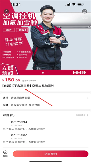 4、空調加氟服務頁說明不限品牌、持證上崗等優勢,明確顯示價格及保障政策,支持規格選擇與快捷預約操作。