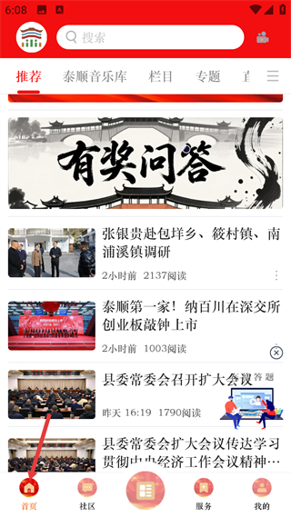2、切換到首頁板塊能瀏覽本地政務調研企業動態等資訊,參與有獎問答互動,獲取區域核心信息與各類活動內容。