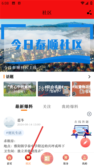 3、打開社區板塊可參與話題討論,發布租房閑置物品等生活爆料,和本地居民交流互動,分享日常相關內容。